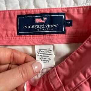 Vineyard Vines Salmon Pink Chino Shorts Size 32. Good condition, small mark on front near pocket as seen in photos. Back pockets. Classic button & zip fly closure.