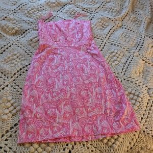 Like new Vineyard Vines Shells All Over pink she'll pattern strapless dress. No major flaws, stains, etc. Size 0. Perfect for that summer wedding or event. Can be dressed up or worn with flip-flops for a casual look. 97% cotton 3% spandex outside later. 100% cotton lining. Side zipper. Hooks for straps but straps are gone.