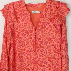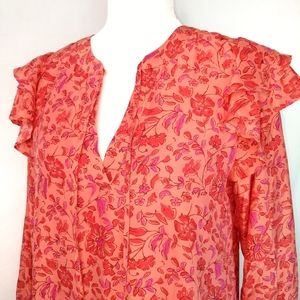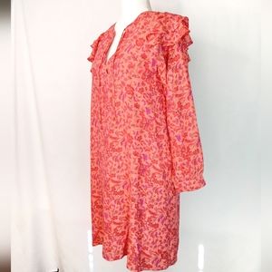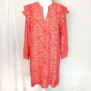 Beautiful Summer dress with an orange background with flowers in red and hot pink 2 tier ruffle on shoulders, ties at neck and fabric covered button cuffs Fully lined No Flaws..like new Length 35 Bust 19.5 Sleeves 23 T h a n k Y o u Any ?? Please ask Full Time Posher...Smoke Free..pet friendly