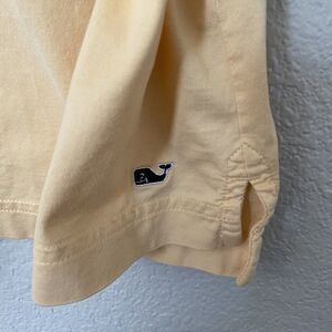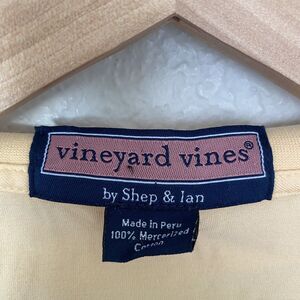 This Vineyard Vines polo shirt in size L is a stylish addition to any wardrobe. The shirt features a collared neckline, short sleeves, and a solid pattern with an embroidered whale character. Made of mercerized cotton , the shirt is machine washable with a medium fabric wash. Accented with buttons and the Vineyard Vines logo, this shirt is perfect for any occasion, whether it's a day at the beach or a round of golf. The shirt is designed with a regular fit and is tagless, stretchy, breathable, and suitable for all seasons. No size tag please see pictures for measurements