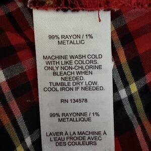 Color/Pattern: Red tartan plaid with subtle metallic thread accents