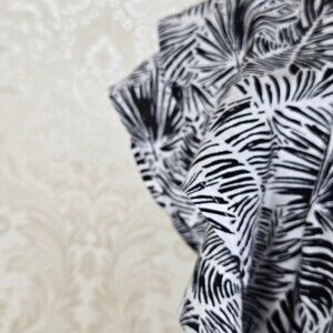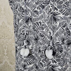 This black and white shift dress has an all over palm leaf pattern with embroidered trim and ties with pompom ends. Split neck. Short ruffled sleeves. Pull on style. Side vents at bottom hem. No lining. No pockets.