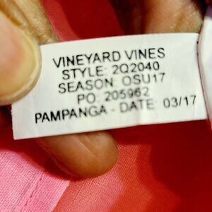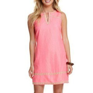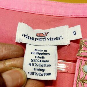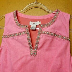 Pink sleeveless sheath dress by Vineyard Vines, size 0. Hidden side zip; gold embroidery with beads around v-neck collar. Dress is 55% linen, 45% cotton. Stock pic is similar, not exact style, offered to show possible fit. Excellent pre-owned condition overall; small spot on front (barely noticeable).