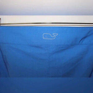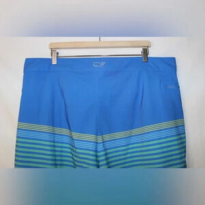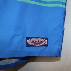 Men’s Vineyard Vines Striped Unlined Board Shorts with Zippered Pocket Size 40. This is in a blue color way with green, blue, and yellow strips and the vineyard vines patch on the lower left leg. This has a Velcro closure and a drawstring waist closure. These also have one zippered pocket on the right side. These are in good used condition with no flaws.