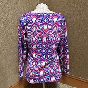 Very soft cotton, pretty ikat print pullover sweatshirt that's fun and fashionable.
