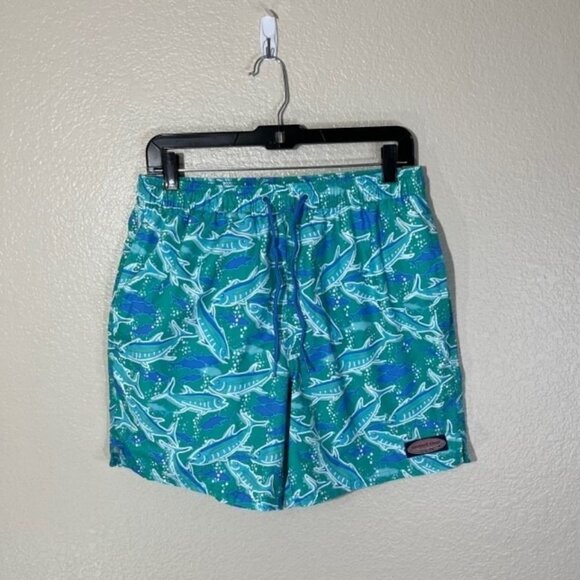 Vineyard Vines Swim Trunks Mens Small Shorts Blue Fish Print Logo 6" Inseam