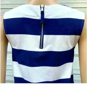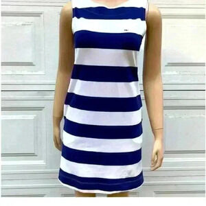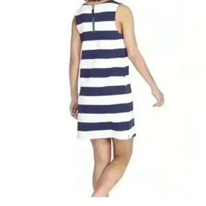 Features: blue and white mini dress, striped print, weight knit, round neck, sleeveless, side pockets, vineyard vines whale logo at the chest, shift silhouette, side pockets, back zipper, unlined Tags: spring summer beach vacation pool coverup swim casual lounge preppy