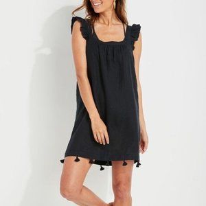 With a flattering square neckline, sweet ruffles and fun tassels on the hemline.