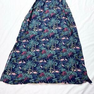 Introducing a Vineyard Vines Textured Button Front Kaftan Sleeveless Dress in women's size small, in a beautiful tropical navy color. This lightweight dress features a relaxed fit and textured fabric, adorned with a fun palm tree and flamingo print. This item is used good condition.