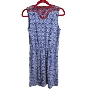 Vineyard Vines Tile Print Embroidered Jersey Knit Dress Size S. Pit to pit 18", shoulder to hem 37", Sleeveless, Color Marlin Blue, Red Embroidery Accent, V Neck, Popover Style, Preppy, Coastal, Retail $148. Good Pre-Owned Condition