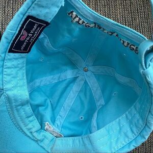 One size fits most vineyard vines turquoise blue embroidered logo ball cap. Embroidered whale on the front and Vineyaed Vines across the back. Adjustable. Unisex