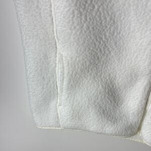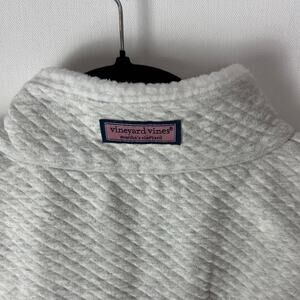 Gently Used Vineyard Vines Full Zip Vest. This is a women's XL. Mostly a white sherpa fleece. Upper on the shoulders is a light gray diamond quilt. Vineyard Vines text logo patch on the chest. Fleece portion is 100% polyester, upper is 79% cotton, 21% polyester. Cute vest!
