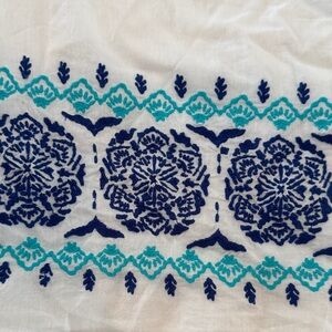 Elegant white dress with blue embroidery. Features tassel ties and short sleeves. Perfect for casual outings.