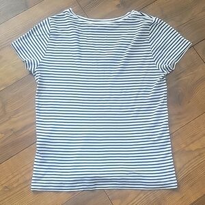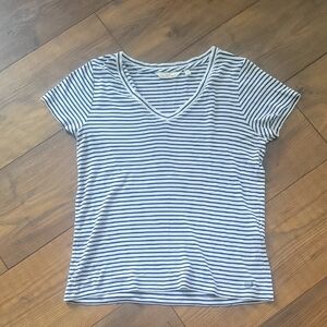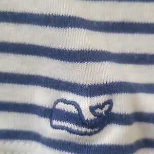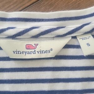 Vineyard Vines Women's Striped V-Neck T-shirt, Size Small. This stylish women's top features a classic blue and white striped pattern. Perfect for casual outings, it offers a comfortable fit with a chic V-neck design.