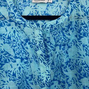 Pretty royal and light blue coral and starfish design. Very Good condition, no imperfections. Lightweight material. Can be worn as a tunic over white jeans or as a shorter swim coverup. Photo appear to have variance in the colors of the shirt, but it's just the lighting.