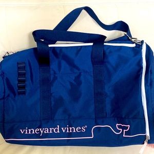 This Whale Line Duffel Bag from vineyard vines for Target. This nautical duffel bag features a solid navy color with a unique line design in light pink that has a whale accent for a fun touch of style. It has a roomy interior that's perfect for tucking away clothes and toiletries, while exterior slip and zipper pockets help keep your important items close at hand. 14.2 x 22.1 x 8.7. Never used.
