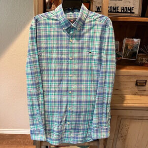 EUC Vineyard Vines men’s performance whale shirt size Large. This shirt is in like new condition! Pretty blues color way, stitched logo on front chest, all buttons intact! Check photos for measurements in inches!