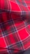 Red with a green, black, and blue plaid with a metallic thread running through it. Diagonal front pockets, zipper fly with metal clasp and inner button closure.