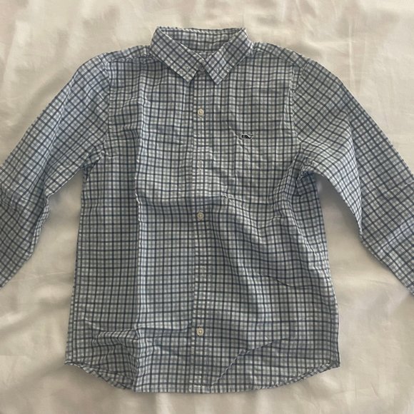 NEW, never worn. Boys size 7. Light blue, dark blue, white plaid long sleeve button down.