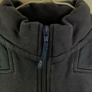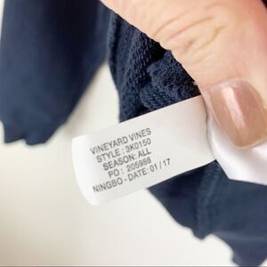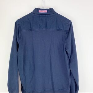 This Vineyard Vines pull-over is in great used condition with one tiny stain on the front as shown. I did not see the stain before washing, so perhaps some pre-treatment would remove more of it. Hard to see unless you are looking. Nice weight for cold weather wear or as a cover-up/jacket in warmer weather. Please see photos for additional details. Pit to Pit 18“ Length 24“ Sleeve 25“