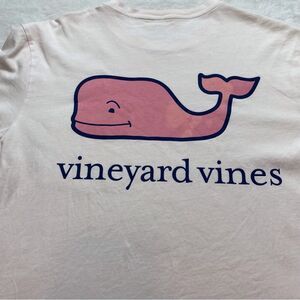 Vineyard Vines Pale Pink One Pocket T-Shirt Size Small. Gently used condition. 2 small spots near bottom right back. Otherwise good condition. “M” on left chest pocket. Whale on back. Measures chest 40”, length 27”, sleeve 8.5”.
