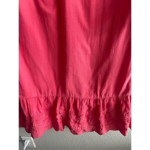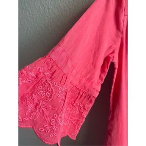 Linen blend red-ish pink dress with bell sleeves and floral embroidered details on ruffles.