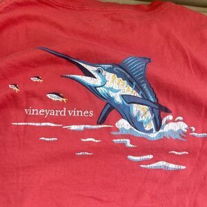Vineyard Vines boys t-shirt, size large, red with swordfish, good used condition.