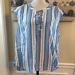 Chic striped blouse with tie-front detail. Ideal for casual or office wear. Lightweight and stylish.