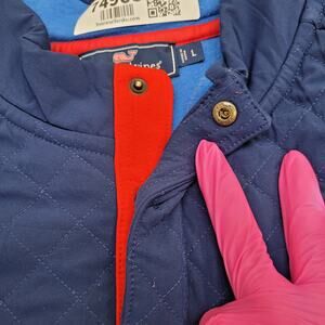 Stay preppy and warm in this Vineyard Vines 2018 quilted pullover featuring a bold whale logo and boxy fit