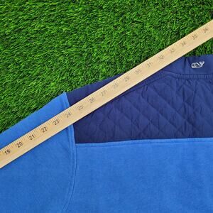 VINEYARD VINES SWEATER LARGE BLUE, 2018 WHALE LOGO HALF ZIP CROP, MARTHA'S VINEYARD BAGGY PULLOVER, 24X28 COTTON BLEND SWEATSHIRT MENS, VINTAGE STYLE QUILTED STREETWEAR TOP, VINEYARD VINES, CROP SWEATER, BAGGY PULLOVER, BLUE HALF ZIP, WHALE LOGO