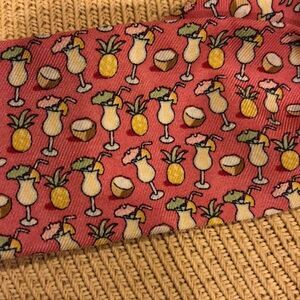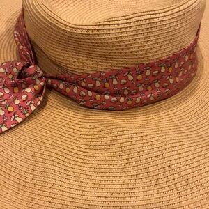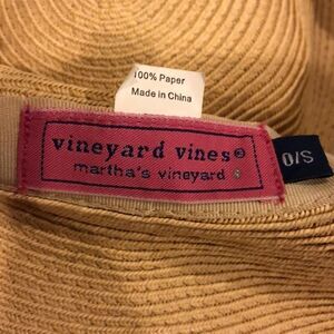 Vineyard Vines straw like beach hat. Pink ribbon with tropical cocktails and fruit. Hat is 19” from one end to the other. Flexible material. Material 100-% paper. Gently used.