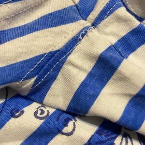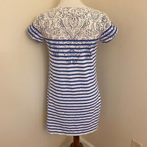 Blue & white striped tshirt dress. Navy floral pattern accent along neckline. Short sleeves. Normal wash wear. Has a couple loose stitches under the armpit as shown.