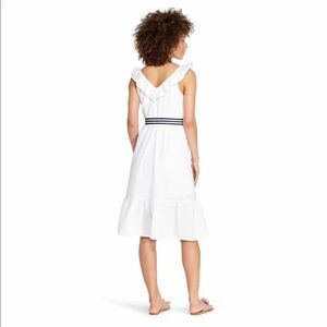 This Dress is missing the cloth blue and white belt as pictured on middle. It is not needed and looks cute by itself.