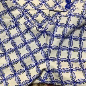 White shorts with blue and yellow floral lattice print. Front and back pockets. Very light blue color bleed on inside thighs as shown in last photo.