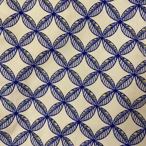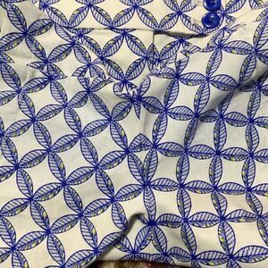 White shorts with blue and yellow floral lattice print. Front and back pockets. Very light blue color bleed on inside thighs as shown in last photo.