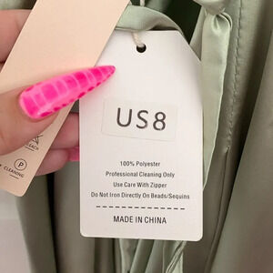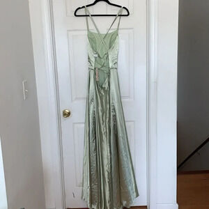 NWT. Vinio Spaghetti Strap Sage Green Satin Prom Dresses with Slit. No Flaws.