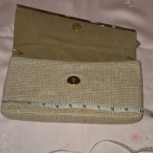 This chic clutch features a stunning gold design with a sleek chain strap, ideal for any stylish outing.