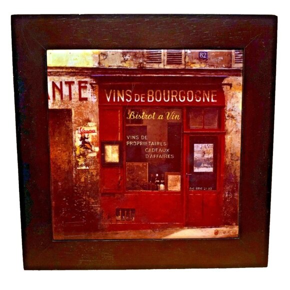 This exquisite piece of wall art captures the charming essence of a French bistro, reminiscent of the quaint streets and inviting establishments of Burgundy. The detailed imagery of a wine shop front, "Vins de Bourgogne," sets a nostalgic tone, making it an evocative addition to any room. A harmonious blend of rustic allure and timeless elegance.