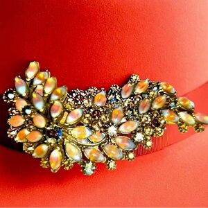 Elegant floral design set featuring navette- shaped opalescent givre glass cabochons arranged in leaf/flower patterns, accented with small round rhinestones. The brooch is approximately 2.5 inches long, with matching clip-on earrings about 1 inch
