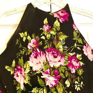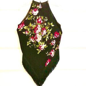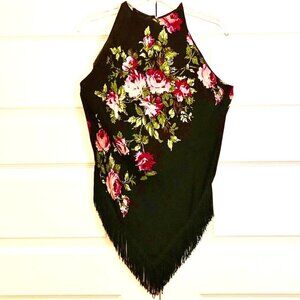 Gorgeous Designer black silk scarf tunic with an artfully flowing diagonal pattern of feminine pink roses that continue to the back, a chic halter-neckline, and finished with a flirty V-shaped black fringed hemline. This beautiful top also has a built-in sheer mesh shelf bra for seamless support …