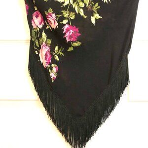 Vint Y2K NICOLE MILLER Silk Fringe Scarf Tunic Top Black Pink Roses 10 MSRP $298