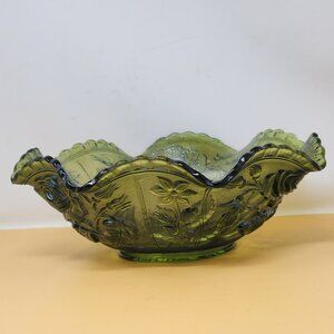 Vintag Green Carnival Style Pressed Glass Rose Pattern Crimped Bowl