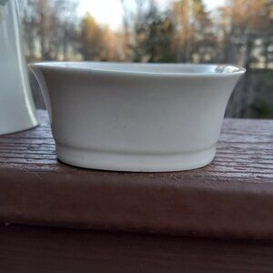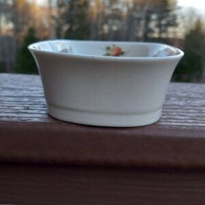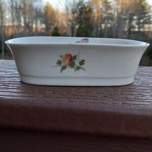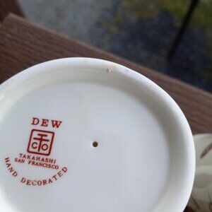Set of three vintage Takahasi Sanfranciso bathroom vanity set. Includes toothbrush holder, soap dish and cup. White with vibrant red, orange, yellow and green butterflies and flowers. Possibly porcelain. Toothbrush holder holds four narrow-handled brushes, and measures approximately 3" across the base and 4" high. The cup measures approximately 2.75" in diameter across the opening, and 3.75" high. (The shading of the inside of the cup (photos 6 & 7) is the camera shadow.) The soap dish measures approximately 3.5" x 5.25" across the top and 1.5" high. The cup and soap dish have slightly yellowed. The cup has a tiny chip in the glaze (photo 8); the underside of the toothbrush holder has a slight glaze imperfection along the rim (photo 10), none of which are noticeable. No chips, cracks, flea bites. In very good vintage condition. Made in Japan.
