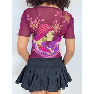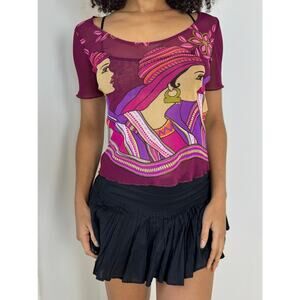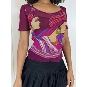 Vintage Y2K euro woman graphic short sleeve baby tee. Purple with pink & orange hues. Oriental woman graphic rocking gold earing loops. Effortless lettuce hem. Fitted and slightly cropped with a wide neck.
