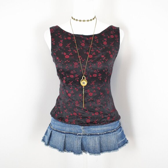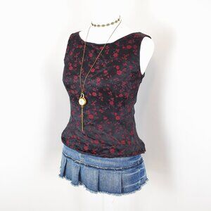 Vintage 00s Y2K Ann Taylor Black & Red Floral Jacquard Boat Neck Tank Top Size 6
