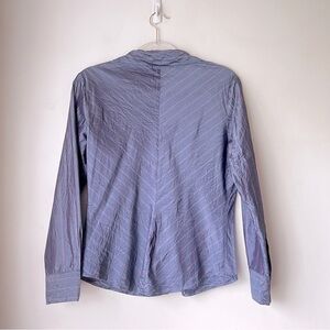 Vintage 00s Y2K Express Blue Pink Pinstripe Silk Blouse 5/6. long sleeve. button front. collared. 100% silk. chambray looking blue color with pinkish purple stripes allover. pit to pit 20", length 25"