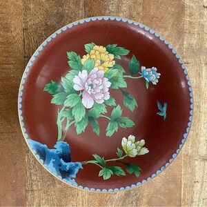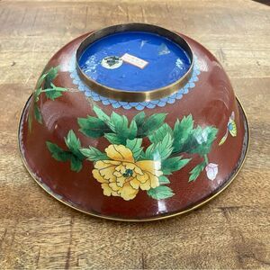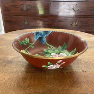 Vintage 10” Cloisonné floral bowl in rust and baby blue with floral design