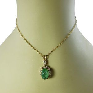 This lovely pendant features one oval cabochon jade stone (13 mm x 10 mm)and ten round brilliant cut diamonds* set in classic 10K yellow gold.