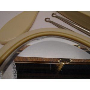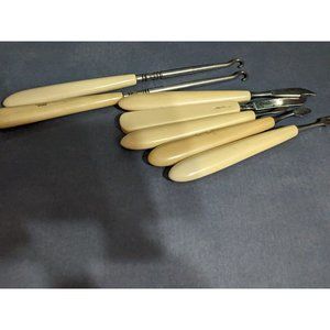 Vintage 10 Piece Vanity / Manicure Set French Ivory Celluloid Art Deco w/ Flaws There is a lot of wear to this set. There is a crack on the left side of the mirror in the bezel as well as spots on the mirror glass and some imperfections on one of the manicure pieces, also the buffer is showing wear along the edges (see photos). The mirror measures approx. 12 in long and 8 in wide. Set includes: Mirror, Brush, Buffer, 5 Manicure Tools, and 2 Button Fasteners.