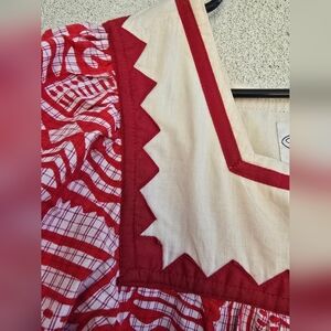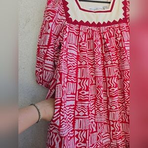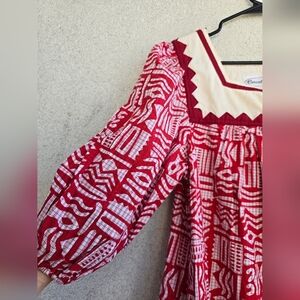 Stylish red and white dress with a unique pattern. Features a square neckline and puff sleeves.